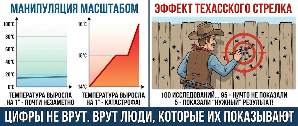 А еще есть метод техасского стрелка - это вообще шедевр. Проводите сто исследований. 95 показывают нулевой результат. Пять случайно (именно случайно!) показывают то, что вам нужно. Вы публикуете эти пять и гордо заявляете: "Смотрите, исследование подтверждает!" Остальные 95? А их просто не упоминаете. Работает безотказно, потому что исследования с отрицательными результатами публикуются реже - они не так интересны журналам, не так сенсационны.