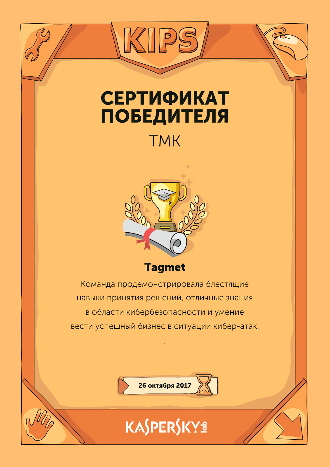 Также в рамках Форума для сотрудников отдела информационной безопасности прошел тренинг Kaspersky Interactive Protection Simulation (KIPS) — пошаговая ролевая стратегия «Лаборатории Касперского» про информационную безопасность бизнеса. Мы разделились на пять команд, по команде от каждого завода. В результате все участники показали высокий уровень знаний по ИБ (все играли в первый раз), а наша команда завоевала почетное первое место.