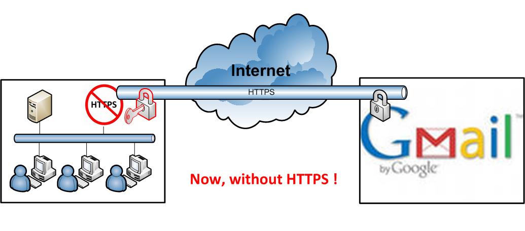 Многие пользователи обратят внимание, что сессия не является защищенной и в строке браузера по-прежнему отображается HTTP. Для урегулирования возможных волнений со стороны пользователей рекомендуется разработать раздел в правилах использования сотрудниками организации ресурсов сети Интернет, в котором организации будет разрешено иметь доступ к защищенным каналам связи и информации, пересылаемой пользователями в них.