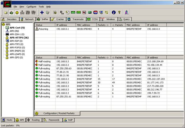 После того, как атака «включена» трафик начинает перенаправляться через ПК злоумышленника. Для подтверждения этого достаточно на ПК жертвы проявить какую-нибудь активность, например, зайти на какой-нибудь web-сайт. Все http запросы начинают отображаться в окне программы Cain & Abel на ПК злоумышленника, по которым легко установить сетевую активность, используя общедоступный DNS сервер.