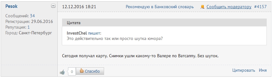 Итак, после уточнения по телефону желаний клиента, а также паспортных данных к вам выезжает работник банка или вовсе курьер из сторонней организации. Такой выездной работник привозит клиенту необходимые документы, например, договор на банковскую карту. Тут же он начинает фотографировать ваш паспорт и вас. Я давно предполагал, что на этом этапе могут легко утекать паспортные данные. Я всегда спрашивал у курьеров с помощью чего они фотографируют и пересылают мои персональные данные. И получал ответ, что не нужно беспокоиться, т.к. у них всё передается в защищенном виде и курьер не имеет доступа к пересылаемым фотографиям. Как это делается на самом деле, я хочу показать из обсуждения на банковском форуме: