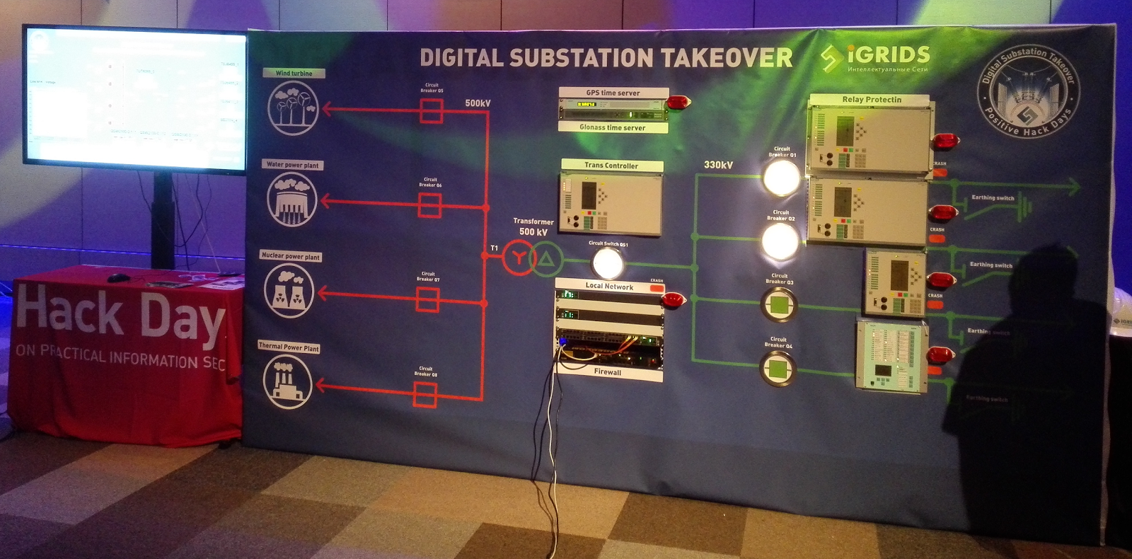В этом году у посетителей форума Positive Hack Days V была возможность увидеть стенд-конкурс «Digital Substation Takeover» от компаний ООО «Интеллектуальные Сети» (iGrids.ru), где можно было попробовать взломать электрическую подстанцию, построенную по стандарту IEC61850. Реальные коммутаторы, сервера времени, контроллеры и устройства релейной защиты, представленные на макете, управляют и защищают современные высоковольтные электрические сети от аварийных и внештатных ситуаций: от коротких замыканий или повреждения на линии электропередач.