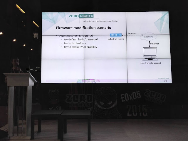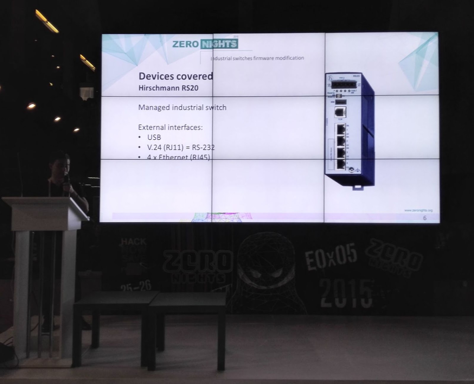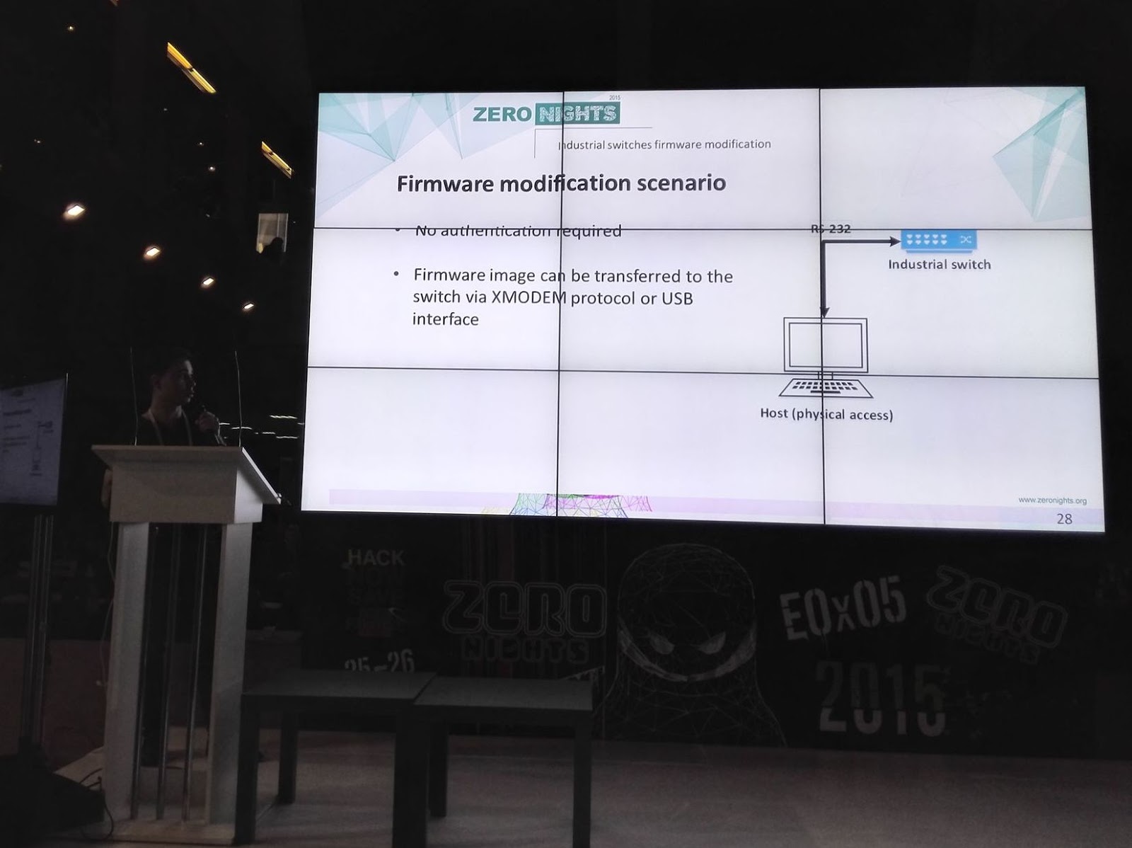 Первым был доклад « Модификация прошивок промышленных свитчей» Александра Ермолова (Digital Security). Были показаны методы подмены прошивки коммутаторов (Hirschmann и Phoenix Contact), используя различные уязвимости и слабости конфигураций «по умолчанию». Подмена прошивки позволяет захватить управление коммутатором с последующим получением возможности контроля технологических процессов (прослушивание и модификация данных внутри различных соединений между PLC и SCADA, между шлюзами и PLC и т. п.).