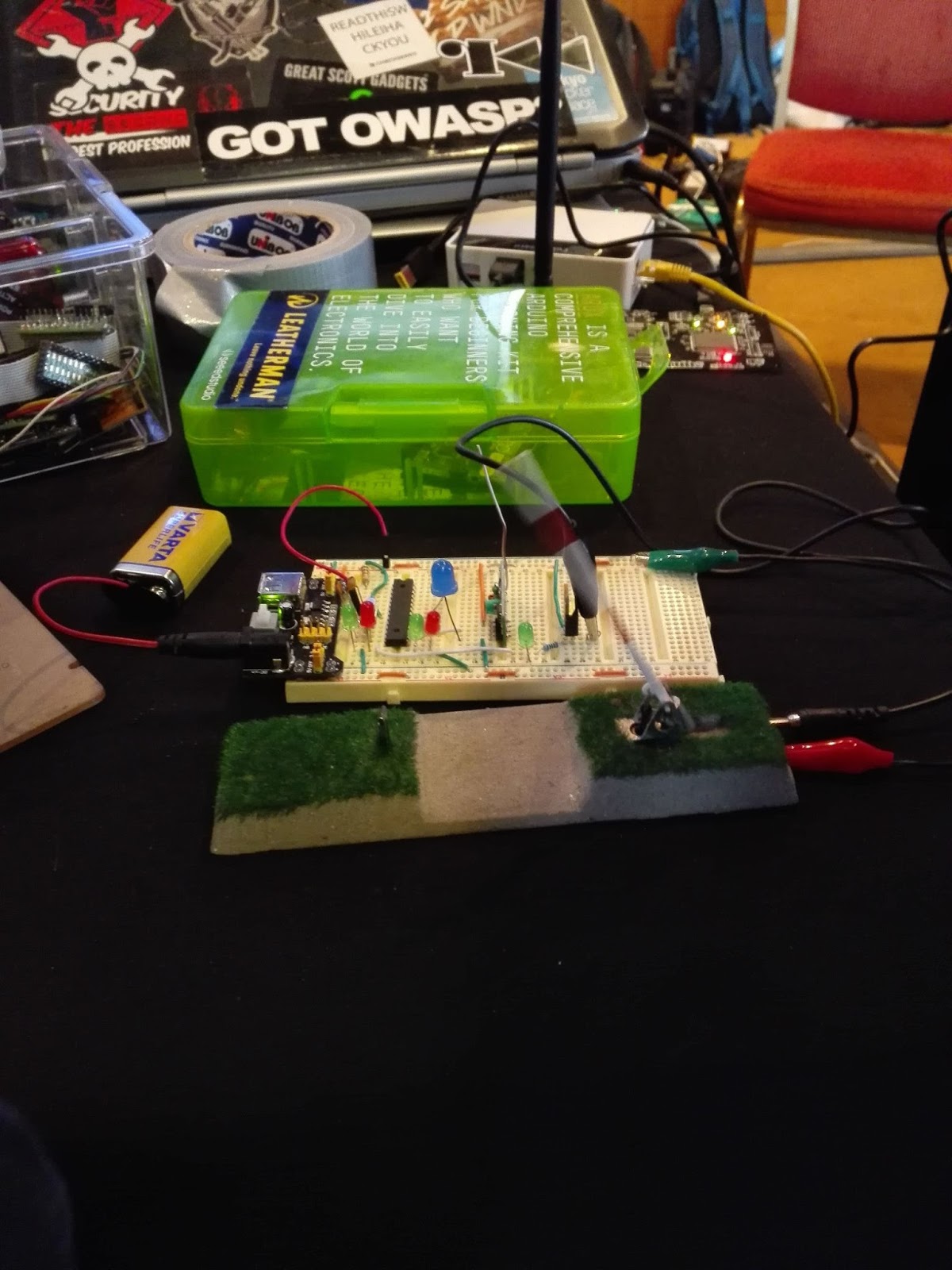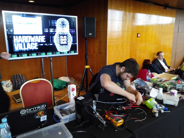«Железная» тема так же была представлена в секции « Hardware Village», посвященной безопасности и эксплуатации аппаратного обеспечения. Были матер-классы, доклады, конкурсы по различным аппаратным темам. Первый день был отдан проводным сетям и стандартным интерфейсам передачи данных: Ethernet, 1Wire, UART, JTAG, SPI и т.д., и оборудованию необходимому для анализа: осциллографы, логические анализаторы и мультиметры. Второй день был посвящен беспроводным сетям. К столам с оборудованием было не протолкнуться оба дня.