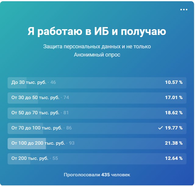 Добрый день, коллеги! Думаю, многим из нас интересно, сколько же получает средний специалист по информационной безопасности? Конечно, интересно. Чтобы удовлетворить любопытство я провела опрос в своей группе ВК.