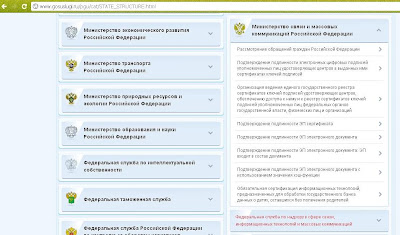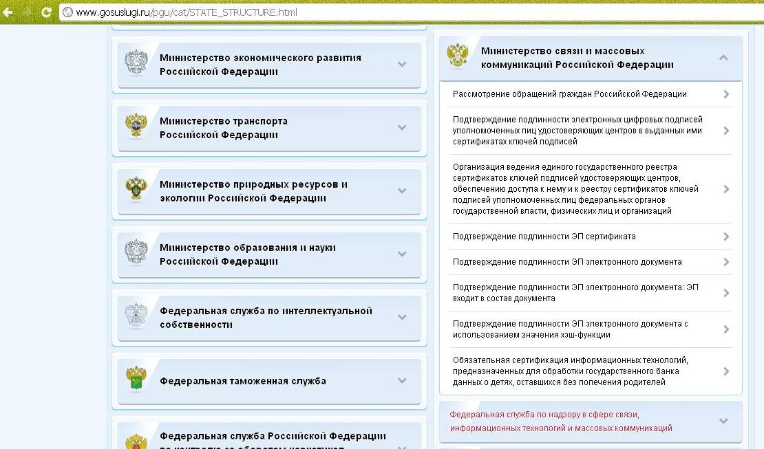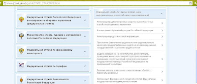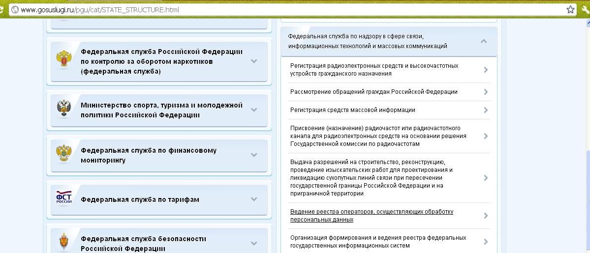 Выбираем раздел "Министерство связи и массовых коммуникаций Российской Федерации", в нем нас интересует подраздел "Федеральная служба по надзору в сфере связи, информационных технологий и массовых коммуникаций" (выделено красным на Рис. 2).