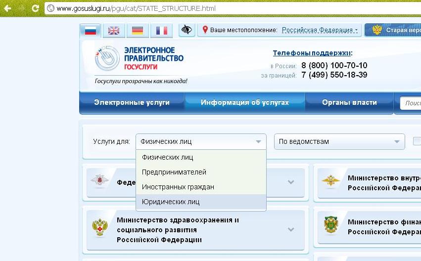 Заходим на портал госуслуги в раздел электронные услуги. Обязательно выбираем пункт - услуги для юридических лиц, так как для физических набор услуг другой.