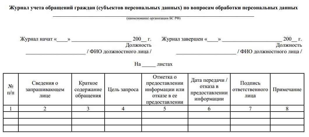 В "Методических рекомендациях по выполнению законодательных требований при обработке персональных данных в организациях банковской системы Российской Федерации" http://www.ib-bank.ru/docs/recommendations.pdf в Приложении 11 есть полезная вещь - журнал учета обращений субъектов персональных данных: