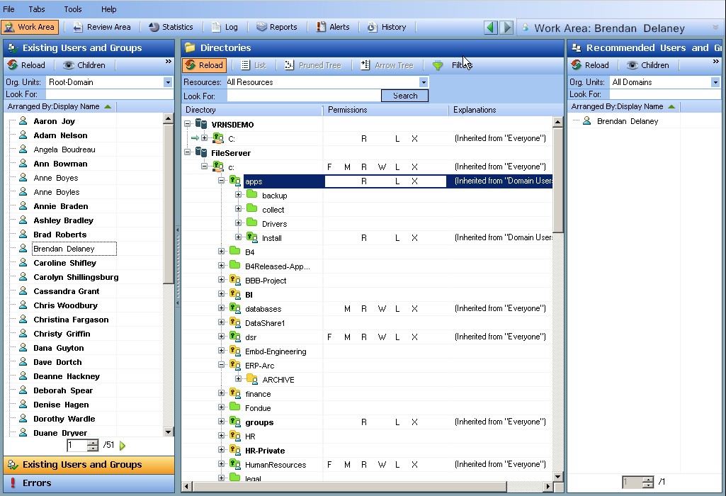 Наиболее основательным примером ПО с устанавливаемой агентской частью на файловых серверах может служить Varonis DataAdvantage. Это ПО, помимо множества иных функций, позволяет в наглядном виде получить списки прав доступа и выявлять изменения прав в реальном времени. Существенным камнем преткновения перед внедрением послужит стоимость продукта. Хотя, если стоит задача проведения разовой инвентаризации активов, можно использовать демо-версию с триальным периодом.