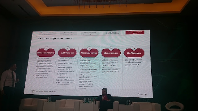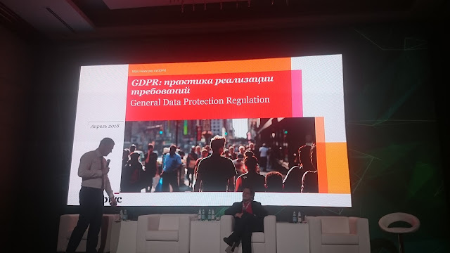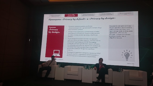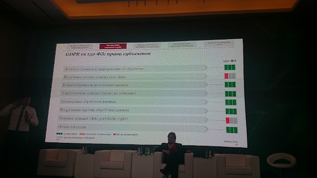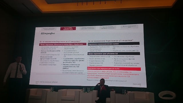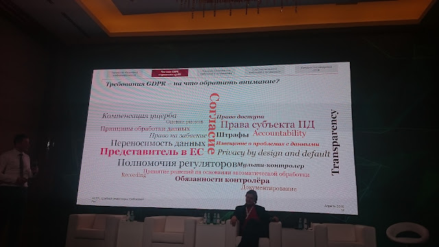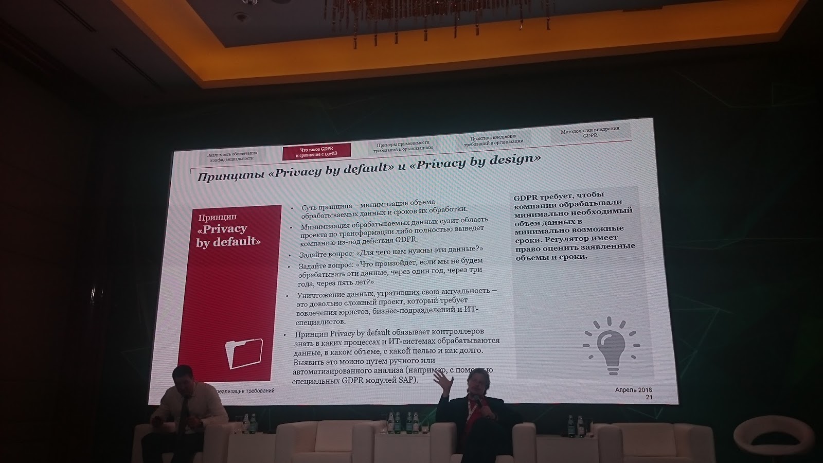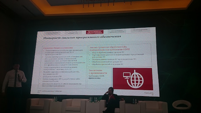 На секцию GDPR шел с опаской, но все оказалось очень интересным и по делу. Удалось задать вопросы публично и в кулуарах. Проектор очень специфично демонстрировал презентацию, даже глазам было больно. Так что, качество фотографий не очень.