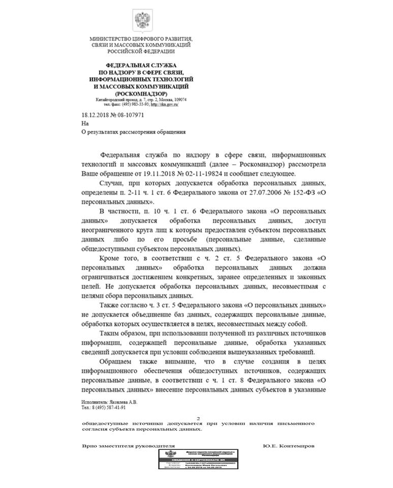 " Федеральная служба в сфере связи, информационных технологий и массовых коммуникаций (далее - Роскомнадзор) рассмотрела Ваше обращение от 27.12.2018 № 02-11-22159 и сообщает, что федеральным органом исполнительной власти, осуществляющим функции по выработке и реализации государственной политики и нормативно-правовому регулированию в сфере обработки персональных данных согласно пункту 1 Положения о Министерстве связи и массовых коммуникаций Российской Федерации, утвержденного постановлением Правительства Российской Федерации от 02.06.2008 № 418, является Министерство связи и массовых коммуникаций Российской Федерации.