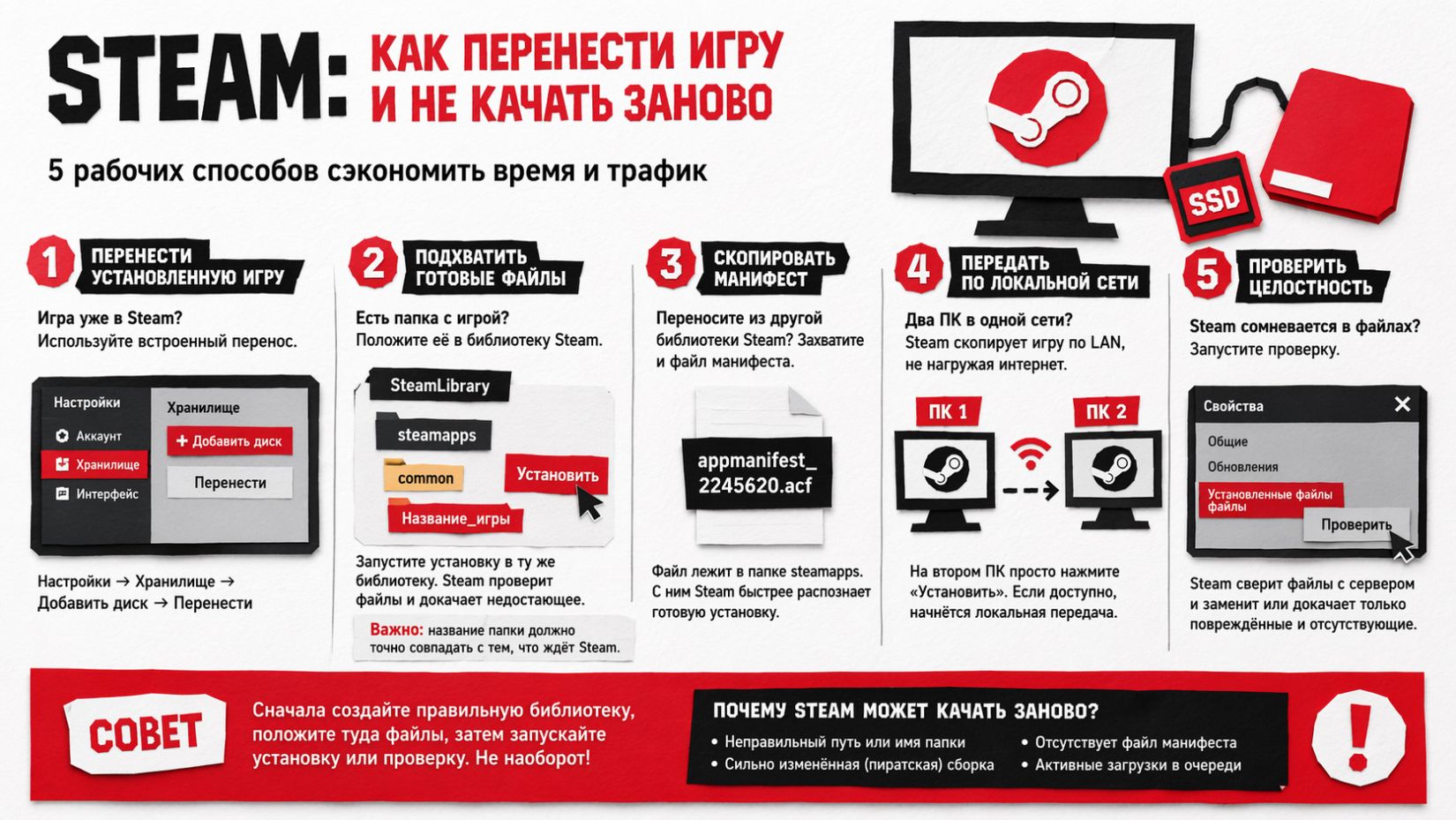 | Игра уже установлена в Steam | Перенос через «Настройки» → «Хранилище» | Аккуратный переезд без повторной загрузки |
