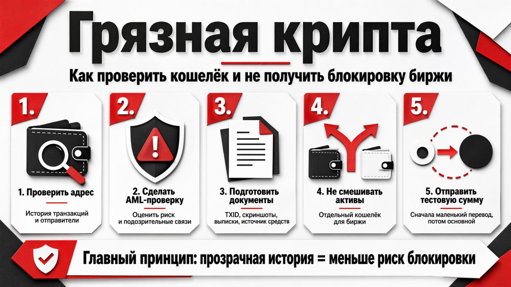 | Смешанные поступления от разных адресов | Непрозрачная история кошелька | Не объединять сомнительные и проверенные активы на одном адресе |