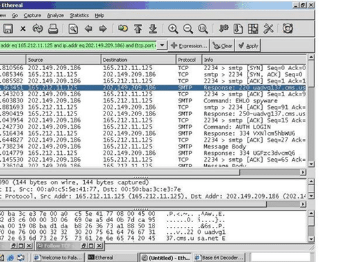 Информация, посланная по почте, была затем перехвачена анализатором сетевого трафика. Для простоты примера мы использовали Ethereal (Рис. 4 и Рис. 5):