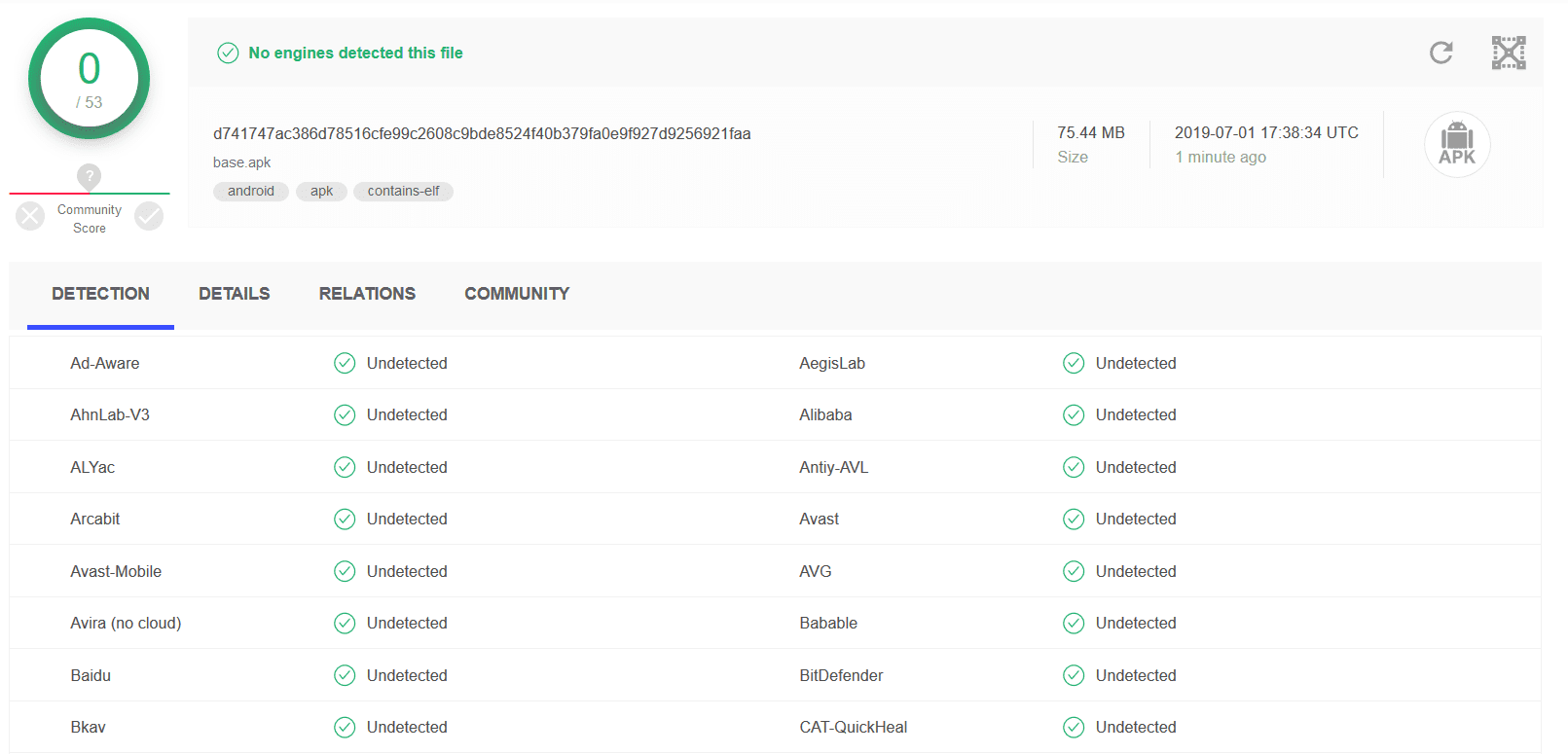Virustotal нам ничего не покажет, так как ничего “нелегального” мы делаем. Мы всего-лишь пользуемся доступными разрешениями нашего приложения.