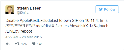 Специалисты Apple оперативно исправили ошибки в OS X El Capitan 10.11.4 и iOS 9.3, однако патчи оказались неэффективными. Немецкий эксперт в области компьютерной безопасности Штефан Эссер (Stefan Esser) продемонстрировал, как можно обойти защиту при помощи серии команд, умещающихся всего в один твит.