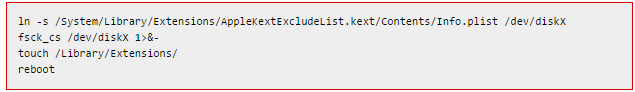 Продемонстрированная Эссером команда создает на одном из дисков символьную ссылку на файл Info.plist, относящийся к расширению AppleKextExcludeList.kext. В Info.plist содержатся списки расширений ядра. Данными списками SIP руководствуется при решении, какие расширения загружать, а какие блокировать. Затем подсистема запускает на диске инструмент fsck_cs и перенаправляет выводимую ей информацию в созданную ссылку. Поскольку ограничения SIP не распространяются на данную утилиту, она перезаписывает содержимое Info.plist. Далее применяется команда touch, и система перезагружается.