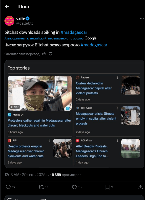 В социальных сетях появилось сообщение пользователя под ником @callebtc, который написал, что загрузки Bitchat «резко растут в Мадагаскаре» и приложил скриншоты новостных сюжетов о протестах.