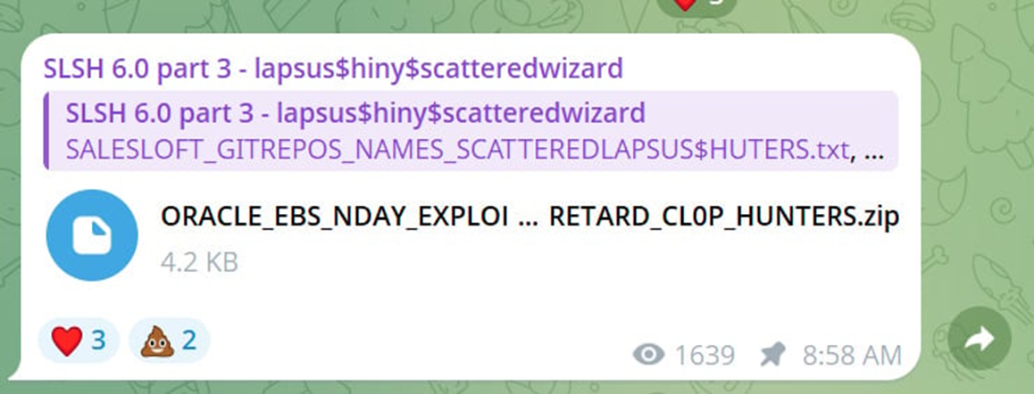 Интересно, что сведения об эксплойте Oracle EBS впервые появились не от Clop, а от другой хакерской группировки — Scattered Lapsus$ Hunters. Она опубликовала в Telegram архив с названием «ORACLE_EBS_NDAY_EXPLOIT_POC_SCATTERED_LAPSUS_RETARD_CL0P_HUNTERS.zip», включающий два Python-скрипта (exp.py и server.py) и файл readme.md с инструкциями по эксплуатации уязвимости. Позже Oracle подтвердила, что именно этот архив совпадает с эксплойтом, фигурирующим в индикаторах компрометации.