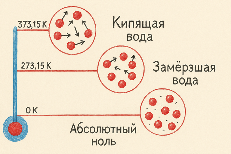 Температура — это мера энергии, а точнее, движения атомов и молекул. В твёрдых телах они вибрируют, в жидкостях и газах движутся хаотичнее. Чем выше средняя энергия, тем быстрее движение частиц и выше температура. При приближении к абсолютному нулю движение замедляется до почти полного покоя. Кажется, что стоит удалить ещё немного тепла — и всё остановится. Но тут в игру вступает третий закон термодинамики.