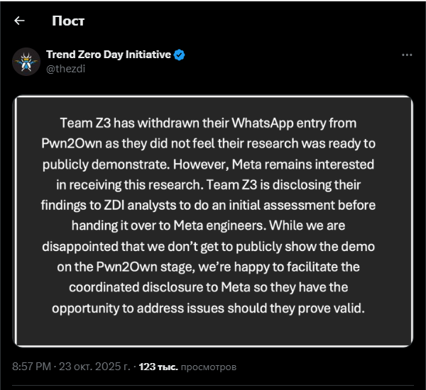 Исследователи из команды Z3 отказались от демонстрации уязвимости в WhatsApp на хакерском турнире Pwn2Own Ireland 2025, хотя именно эта атака могла принести рекордный приз в $1 млн. Как пояснила Zero Day Initiative, команда решила не показывать эксплойт публично, сочтя исследование «недостаточно готовым».
