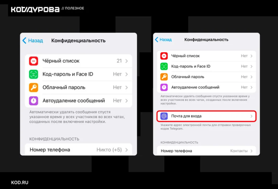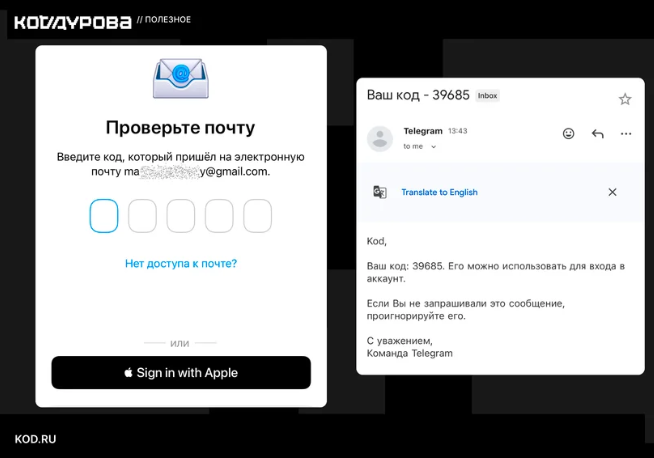 Если пункт «Почта для входа» уже отображается, нужно добавить свой адрес электронной почты — лучше всего Gmail от Google. Если этого пункта пока нет, «Код Дурова» советует воспользоваться обходным способом, чтобы активировать функцию вручную.