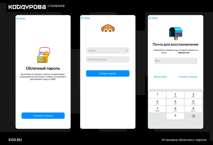 Важно: почта для входа должна отличаться от адреса, используемого для восстановления облачного пароля. Это обеспечивает двухфакторную защиту — код для входа и пароль или код для его сброса.