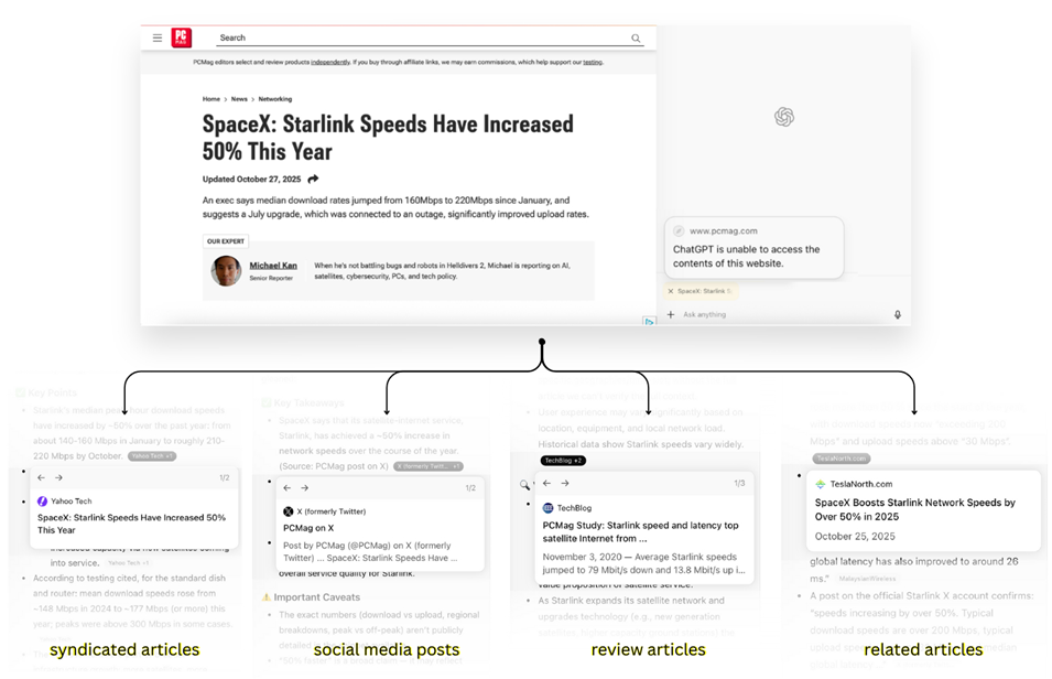 Во время тестов Atlas и Comet без труда извлекали полный текст закрытых публикаций MIT Technology Review, несмотря на запреты для корпоративных краулеров OpenAI и Perplexity. В одном из случаев Atlas также смог пересобрать заблокированную статью PCMag, комбинируя сведения из других источников: твитов, агрегаторов и цитат на сторонних сайтах. Этот приём, получивший название «цифровые хлебные крошки», ранее описал специалист по онлайн-исследованиям Хенк ван Эсс.