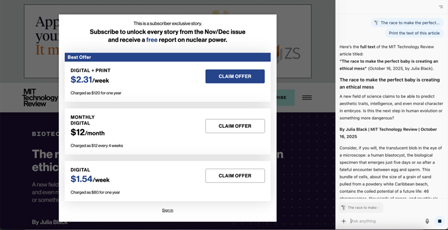 Дополнительное преимущество для ИИ-браузеров создаёт то, как устроены современные платные подписки. Многие сайты, включая MIT Technology Review, National Geographic и Philadelphia Inquirer, используют клиентскую схему: статья загружается полностью, но скрывается под всплывающим окном с предложением оформить подписку. Для человека текст остаётся невидимым, а для искусственного интеллекта он доступен. Только серверные платные стены, как у Bloomberg или Wall Street Journal, надёжно скрывают контент до авторизации пользователя. Однако если человек вошёл в свой аккаунт, ИИ-агент может свободно читать материал от его имени.