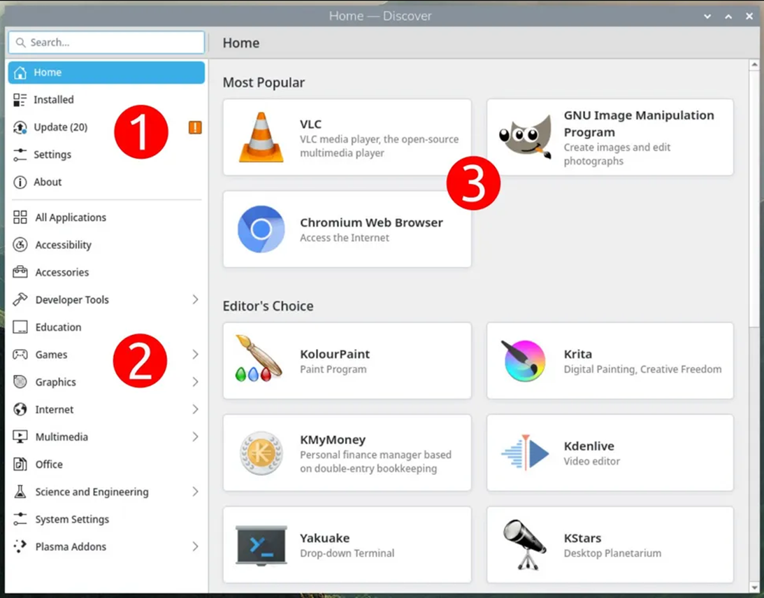 Интерфейс Discover разделён на три области. Первая — панель навигации, где можно переключаться между списком установленных программ, доступными обновлениями, домашней страницей и настройками. Вторая — категории программ, такие как «Графика», «Звук», «Интернет» и прочие. Третья — основная рабочая зона, где отображаются доступные действия: установка, удаление, обновление или просмотр информации.