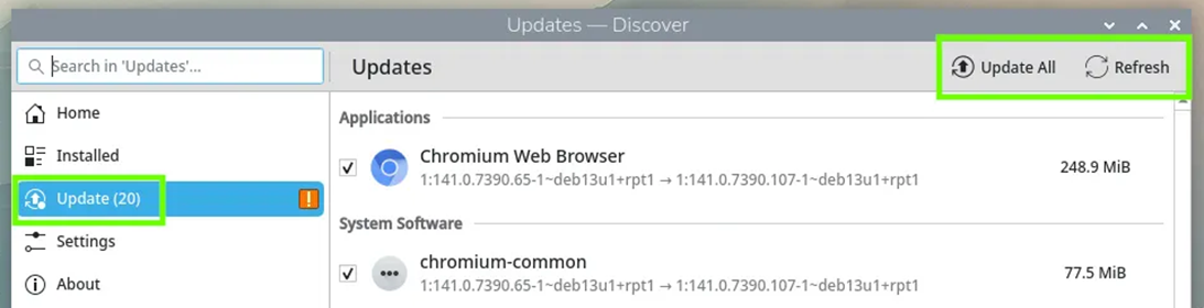 Для обновления установленных приложений достаточно перейти во вкладку «Обновления» и нажать кнопку «Обновить всё». Discover сначала проверит наличие новых версий, а затем предложит установить их одним кликом. Это избавляет от необходимости вручную запускать «apt upgrade» и отслеживать изменения в терминале.