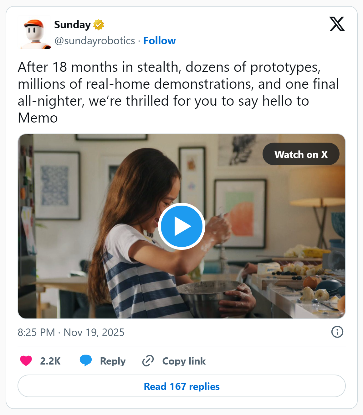 Компания планирует запустить программу раннего доступа Founding Family Beta 19 ноября 2025 года. Для участия отберут 50 семей, которые получат пронумерованные экземпляры Memo и тесную поддержку команды, пока Sunday будет дорабатывать возможности робота перед более широким запуском.