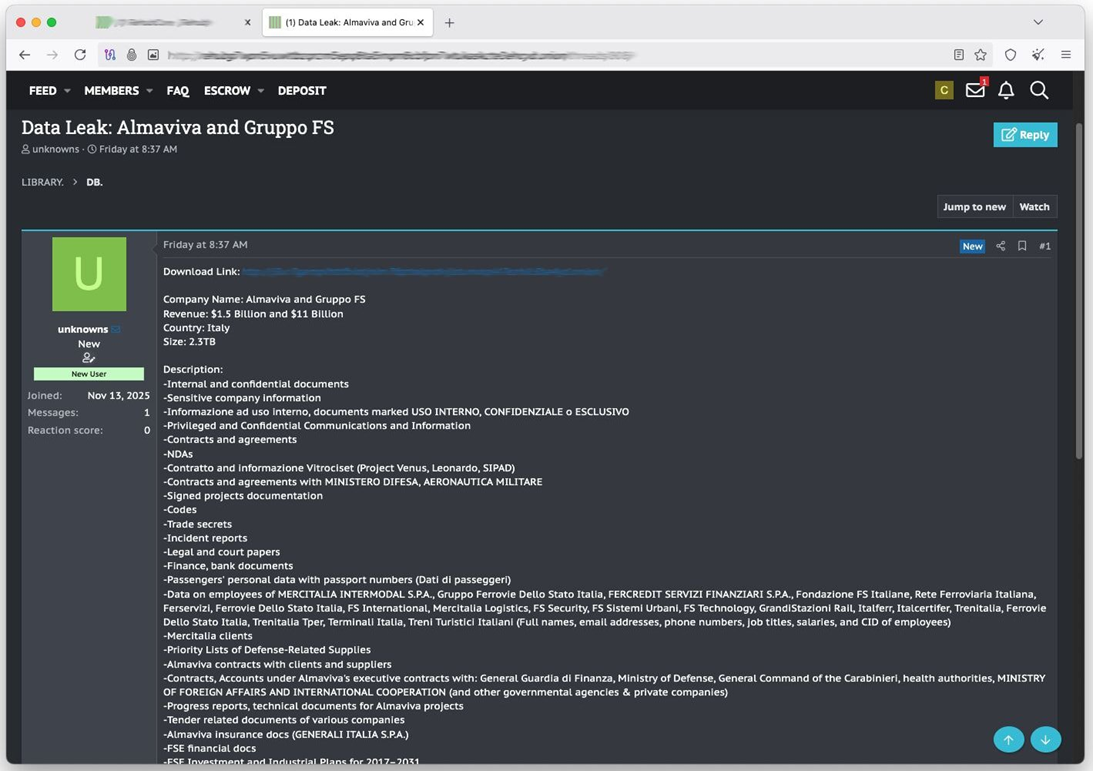 Киберинцидент у Almaviva, компании-подрядчика итальянского железнодорожного холдинга FS Italiane, привёл к появлению в даркнете крупного массива служебных файлов. Объём утечки привлёк повышенное внимание, поскольку в сети оказался многотерабайтный архив с конфиденциальными документами.