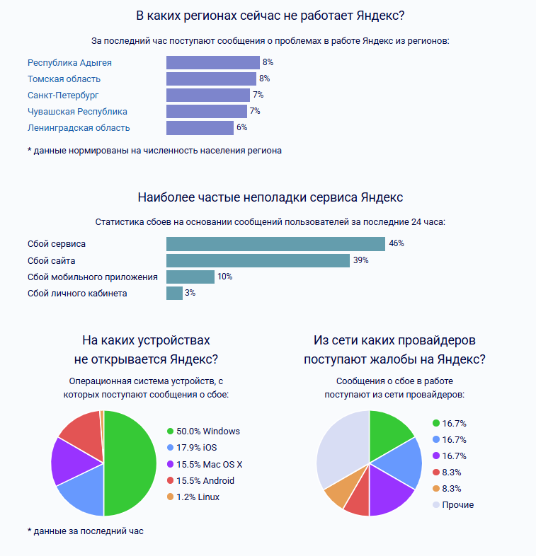 Статистика сбоев за последние 24 часа показывает, что 46 % жалоб связаны с общими проблемами работы сервисов, 39 % касаются сбоев сайта, 10 % приходятся на неполадки мобильных приложений, еще 3 % затрагивают личные кабинеты.