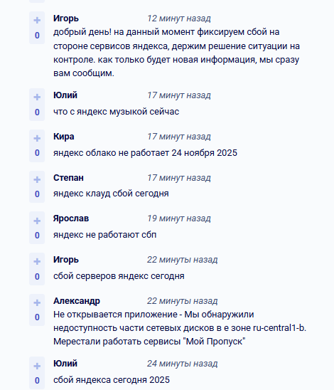 В комментариях пользователи пишут о проблемах с серверами и недоступностью Яндекс Облака, упоминают сбои в зоне ru-central1-b и остановку сервисов на его базе. Отмечаются трудности с доступом к приложениям и сайтам Яндекса, сообщается о проблемах с переводами денег и недоступностью ряда внутренних корпоративных сервисов, включая систему пропусков.