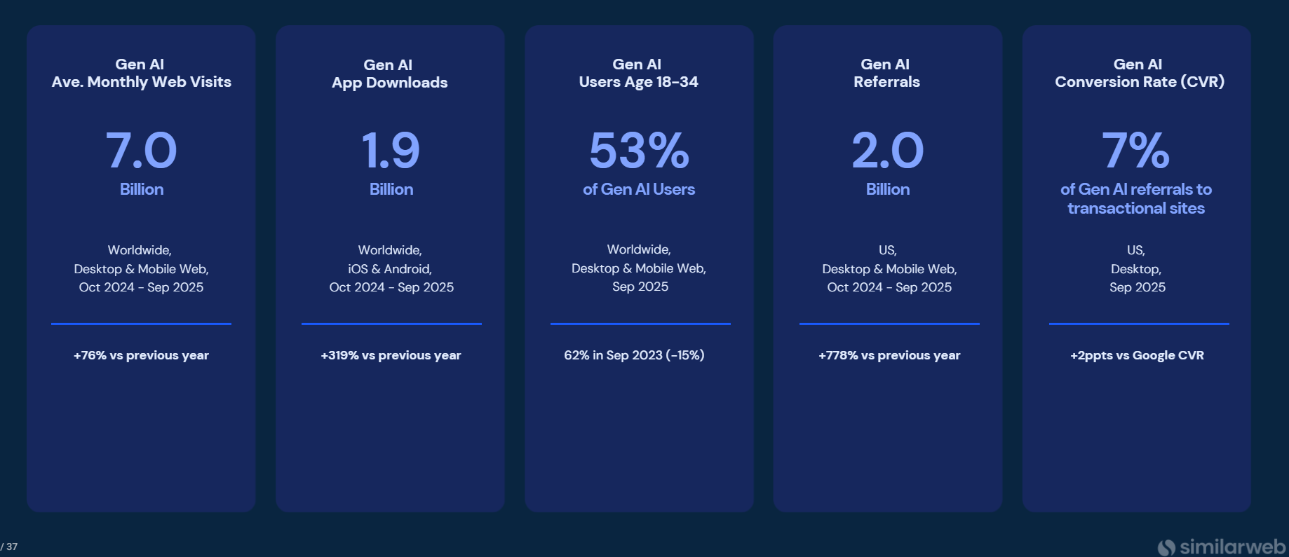 Отчет показывает и другое важное смещение: GenAI-площадки становятся самостоятельным источником трафика. По оценке Similarweb, за год объем реферальных переходов с таких сервисов на внешние сайты вырос почти в восемь раз, до примерно 2 млрд визитов, а конверсия этих переходов в целевые действия на сайтах (покупка, регистрация и т.п.) в среднем достигает 7 %. Это выше, чем у традиционного поиска, что позволяет авторам отчета говорить не только о росте интереса к ИИ, но и о повышении "качества" приводимого трафика.