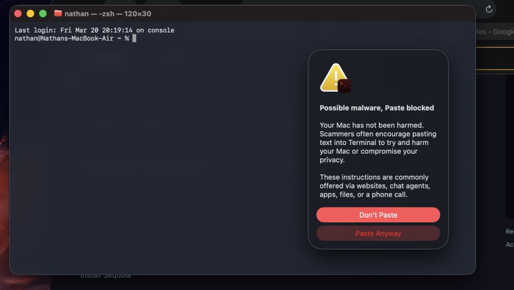 В свежей версии macOS Tahoe 26.4 компания Apple внедрила предупреждение в Terminal. Система реагирует на вставку подозрительных команд и временно блокирует их выполнение. На экране появляется уведомление с пояснением риска и напоминанием о распространённых схемах обмана.