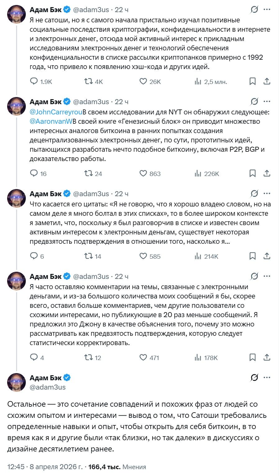 Посты Адама Бэка с опровержением своей причастности к Bitcoin (@adam3us)