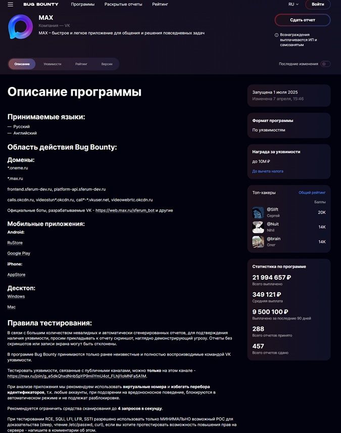 Почва для таких разговоров у Max действительно есть. На странице программы bug bounty на Standoff365 среди самых дорогих сценариев прямо указаны «доступ к приватным сообщениям конкретного пользователя», «доступ ко всему пользовательскому контенту Max» и серверные уязвимости с утечкой защищенных персональных данных, включая случаи вроде IDOR. Там же сказано, что программа работает с 1 июля 2025 года, а к 10 апреля 2026 года валидными признали 288 отчетов из 457, выплатив исследователям почти 22 млн рублей.