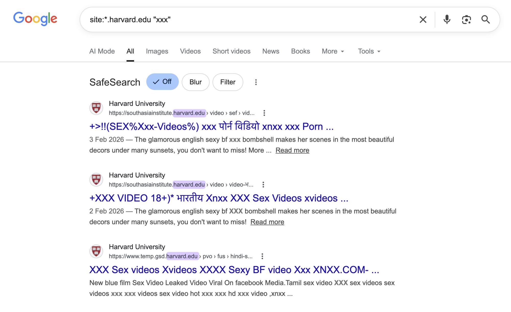 Захваченные адреса применяли для размещения страниц с порнографическим и поисковым спамом. Из-за высокого доверия к доменам .edu такой контент быстро попадал в выдачу Google и ранжировался заметно выше обычных сомнительных сайтов. По данным Infoblox, похожую схему уже использовала группа Hazy Hawk, ранее замеченная при атаках на государственные структуры, включая CDC, а также крупные компании вроде Deloitte и PricewaterhouseCoopers.