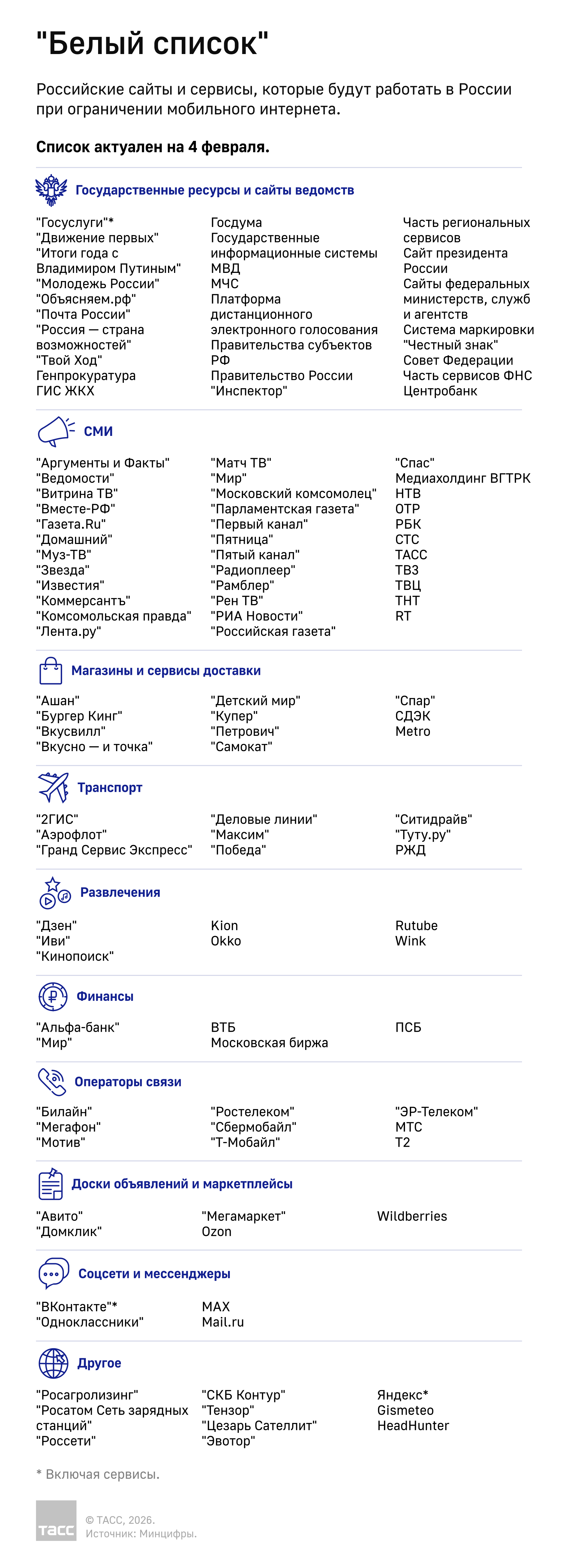 Сейчас в перечень сервисов, которые должны продолжать работу при ограничениях мобильного интернета, входят государственные платформы, банки, операторы связи, маркетплейсы, транспортные и медийные ресурсы.